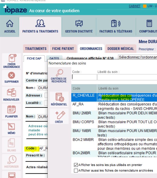Important : Pour que les nouveaux tarifs s’appliquent automatiquement, il faut pointer vos actes à compter du 1er janvier 2026 et avoir choisi l’acte en passant par la nomenclature de Topaze via le bouton CODE de l’ordonnance du patient.