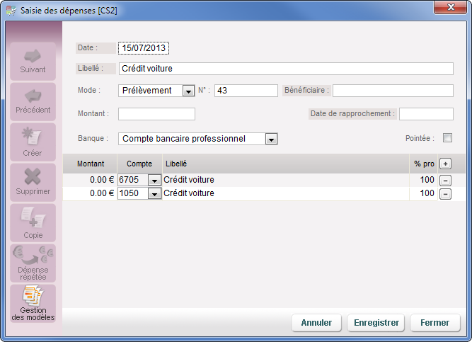 Vous pouvez saisir une écriture en remplissage par les modèles d’écritures de dépenses ou de recettes (le mot « libellé » souligné):