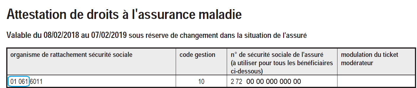 Sur l’attestation de droits de votre patient, cherchez l’organisme de rattachement sécurité sociale et relevez les 5 premiers chiffres du code de l’organisme (cliquez sur l’image pour l’agrandir) :